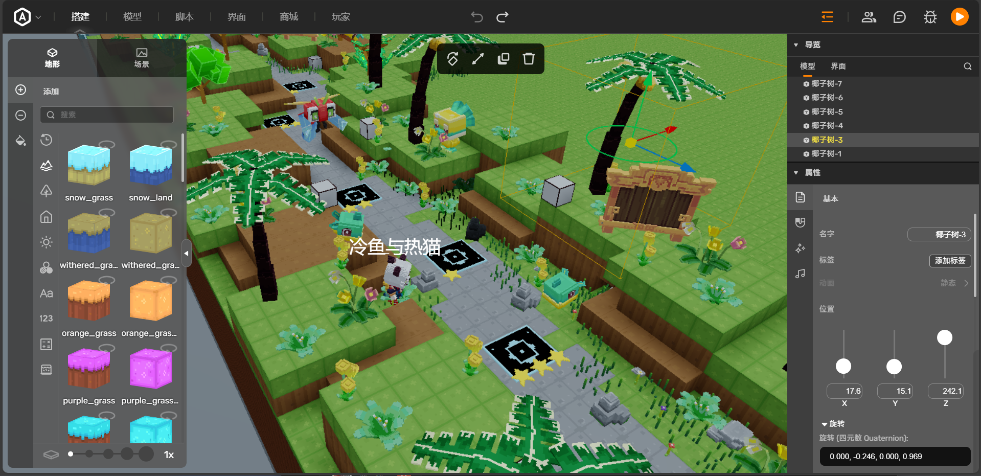 该编辑器支持创作者以拖放方式在3D空间中布置方块和模型,通过丰富的编辑工具调整元素位置、大小、角度等属性,快速构建出多样化的游戏场景。